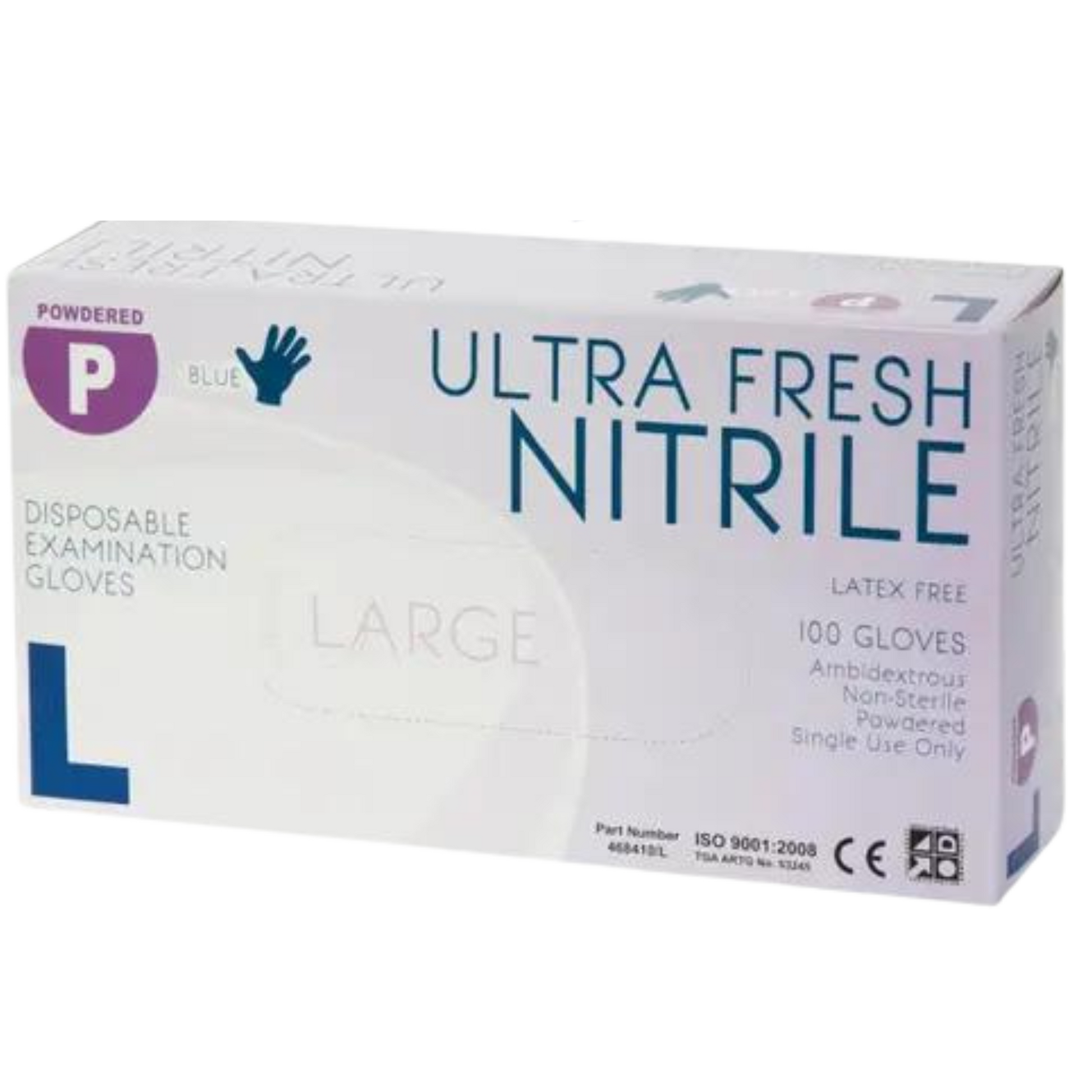 Ultra Fresh Examination Blue Nitrile Powder Free 5.5g Disposable Gloves are designed for healthcare professionals, carers, and everyday users who need reliable hand protection. These gloves provide strength, comfort, and safety without the use of powder, making them suitable for sensitive skin and extended wear.